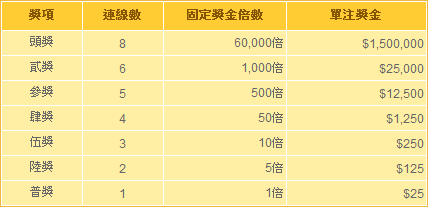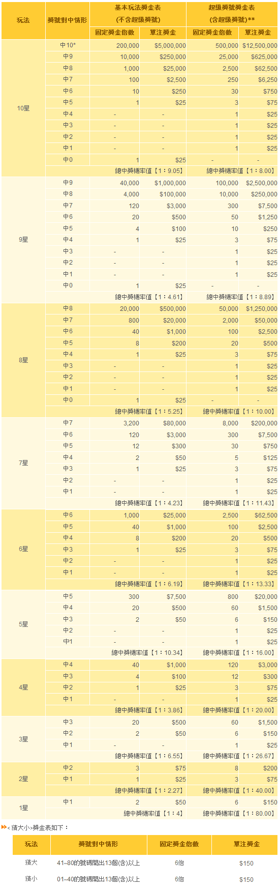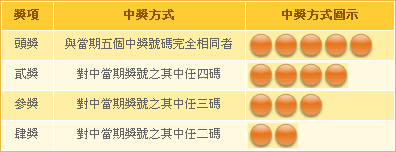 正彩: 如您選擇此玩法,且您的四位數選號與獎號之號碼及順序完全相同,即為中獎。 組彩: 如您選擇此玩法,且您的四位數選號與獎號之號碼完全相同(不計順序),即為中獎。組彩因開出之四位數獎號中號碼重複之情形可分為下列四種: 4組彩:獎號中有三個號碼相同者,例如1112。 6組彩:獎號中有兩對號碼相同者,例如1122。 12組彩:獎號中有二個號碼相同者,例如1123。 24組彩:獎號的四個號碼皆不相同,例如1234。